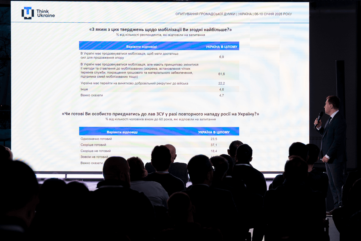 5 лютого в Києві, у просторі D12, команда експертів Think Ukraine презентувала перший етап дослідницької програми «Проєкт країни» — масштабне соціологічне дослідження «Мирна угода: загрози та виклики» з аналізом ключових настроїв та очікувань українського суспільства на початку 2026 року.